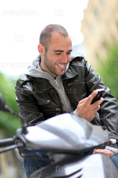 Молодой человек, сидящий на мотоцикл с телефоном