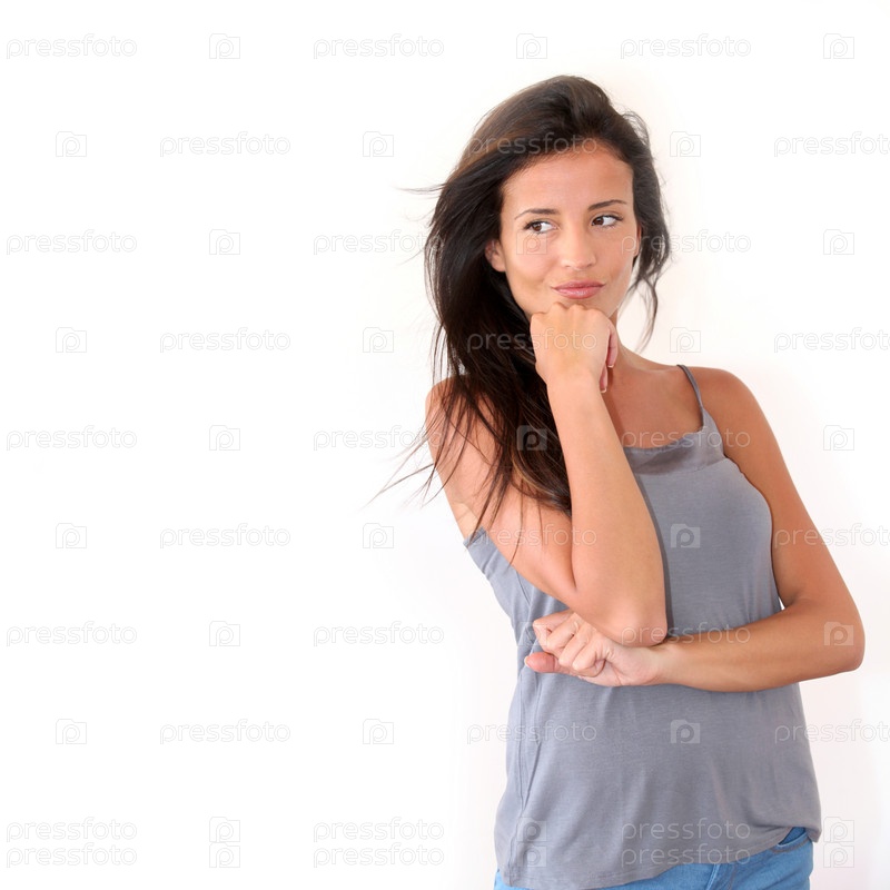 Очаровательная молодая женщина, стоя на белом фоне