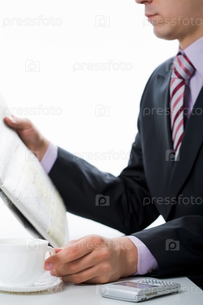 Близкий план мужчины, держащего руку на чашке кофе и читающего газету