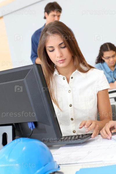 Студент в классе, работая на компьютере