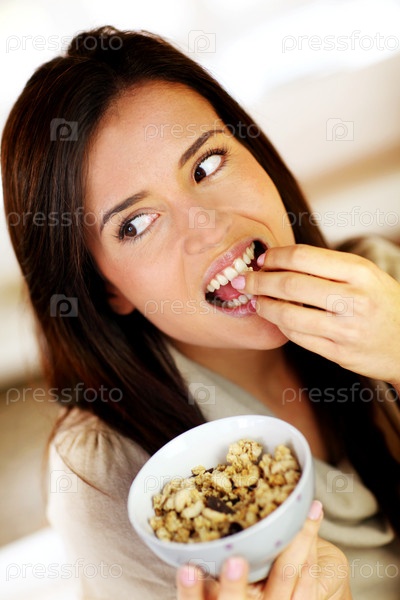 Красивая брюнетка, ест каши по утрам