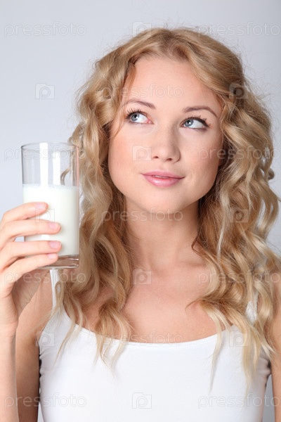 Блондинка женщина пьет свежее молоко
