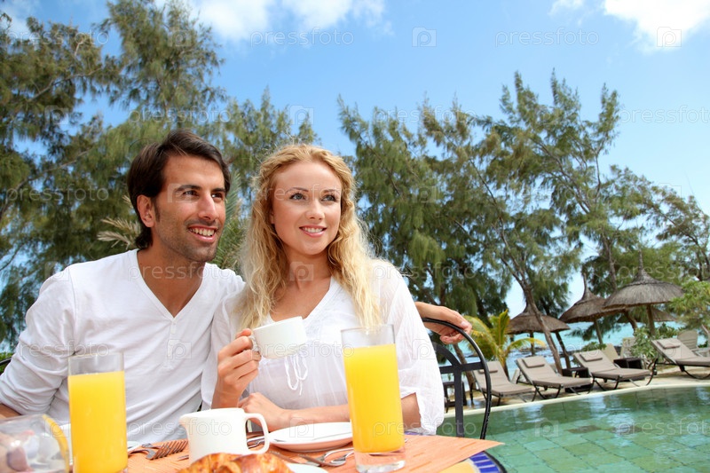Пара, имея Завтрак в роскошный курорт