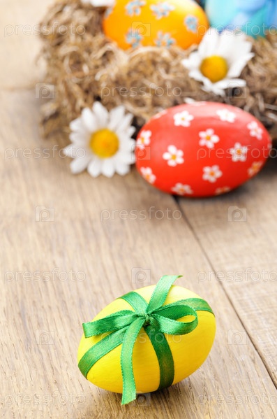 Пасхальное яйцо с бантом на фоне гнездо