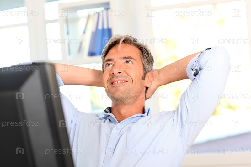 Человек расслабляющий в офисе с вытянутыми руками