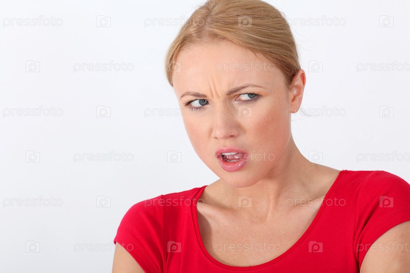 Женщина в красной рубашке с сердитый взгляд