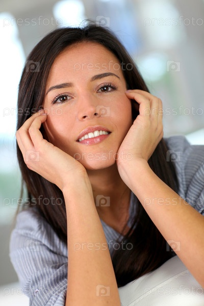 Портрет красивой брюнетки женщины, отдыхаете дома