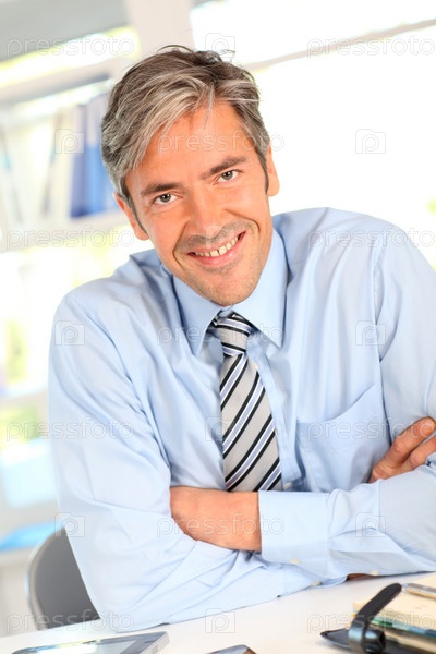 Улыбаясь бизнесмен в офисе со скрещенными руками