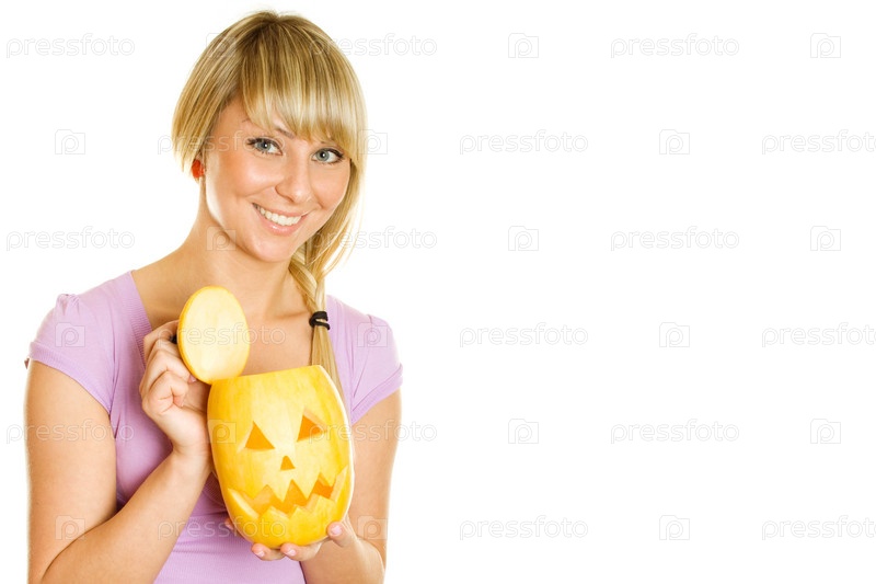 Молодая радостная девушка с тыквой. Хэллоуин