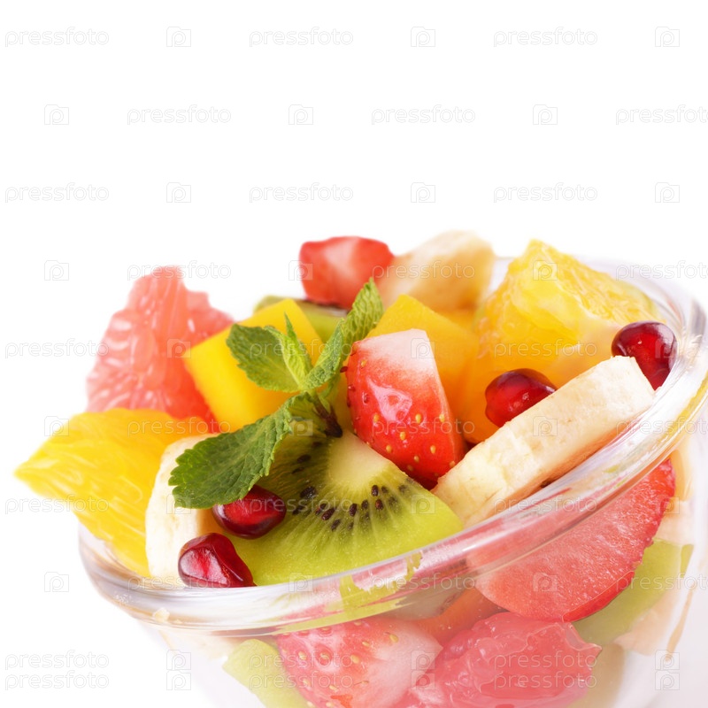 Здоровый фруктовый салат в стеклянной чаши на белом фоне