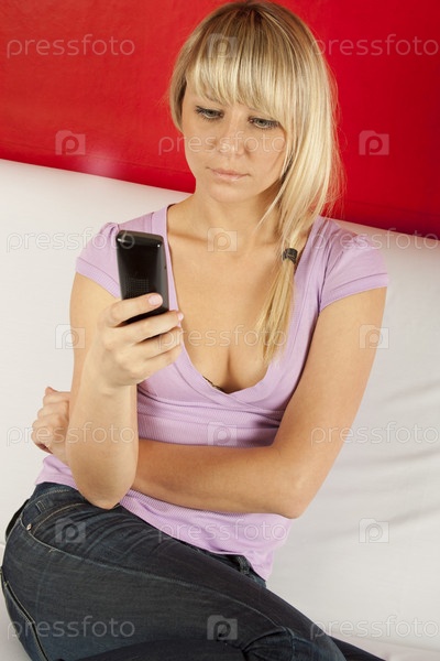 Молодая девушка с сотовым телефоном на диване
