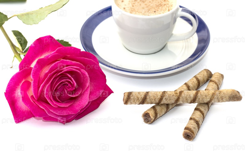 Кружку капучино и цветок розы крупным планом