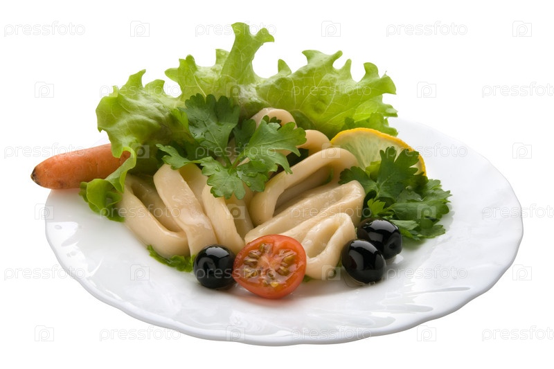 Салат с кольцами кальмара. Изолирован на белом фоне
