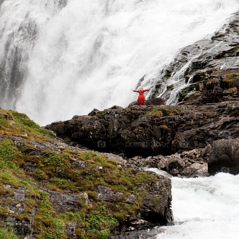 Женщина стоит возле водопада Кьосфоссен, Аурланд, Фьюране, Норвегия