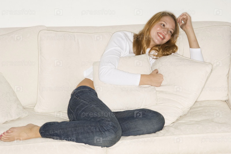 Молодая женщина, лежа на диване