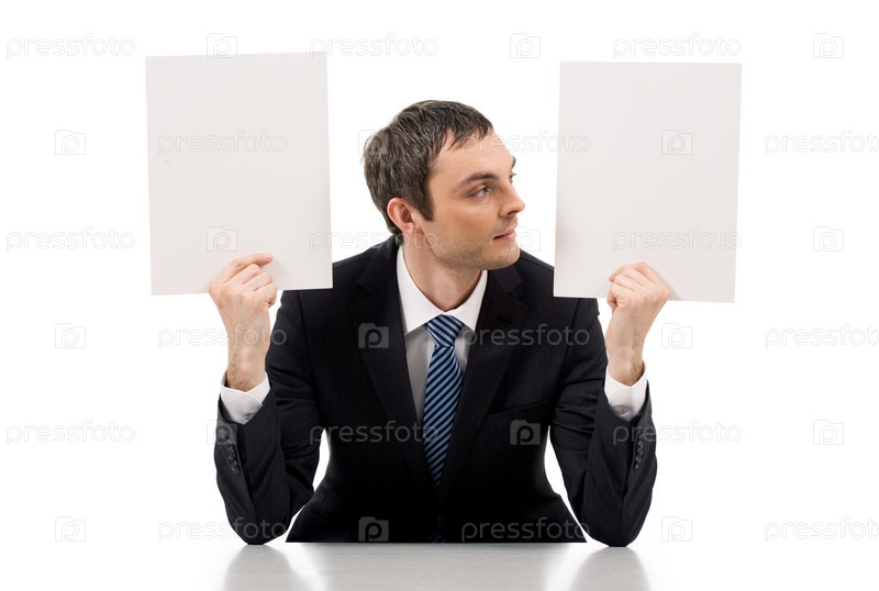 Изображение успешного мужчины, держащего в обеих руках пустые бумаги и оглядывающегося в сторону