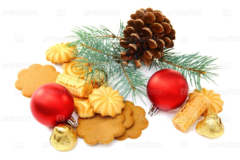 Рождественская композиция с конфетами, печеньем и новогодними шарами на белом фоне
