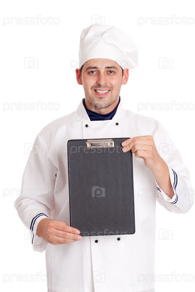 Повар с пустым планшетом на белом фоне