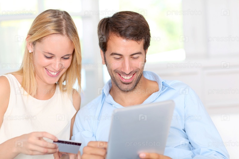 Молодая пара дома делать покупки в Интернете