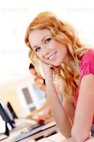 Красивая блондинка работает на портативном компьютере