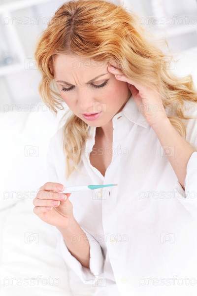 Женщина с лихорадкой глядя на термометр