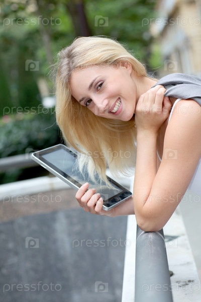Красивая женщина с электронный планшет в городе