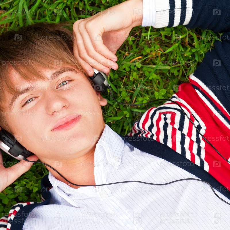 Молодой человек слушает музыку на траве