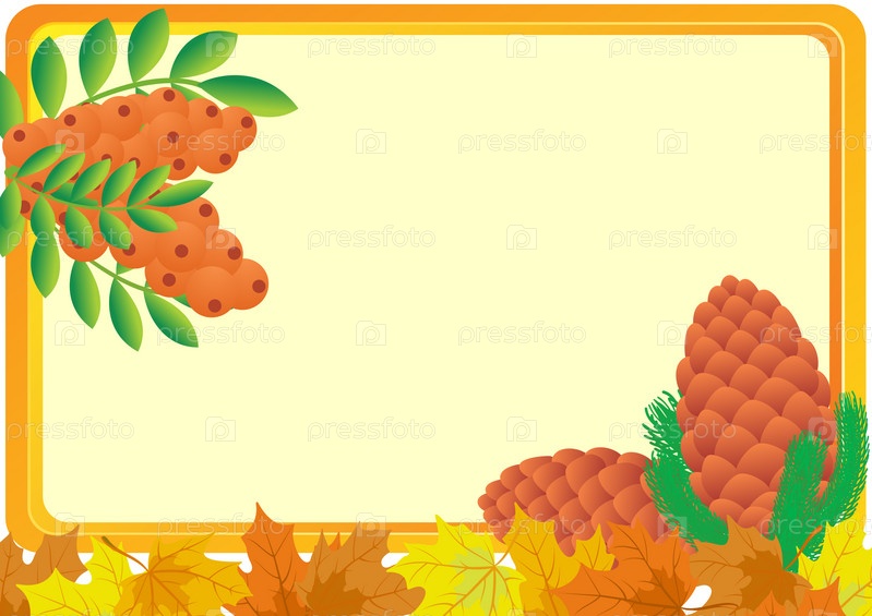 Кленовые листья и еловые шишки на фоне пустой рамки