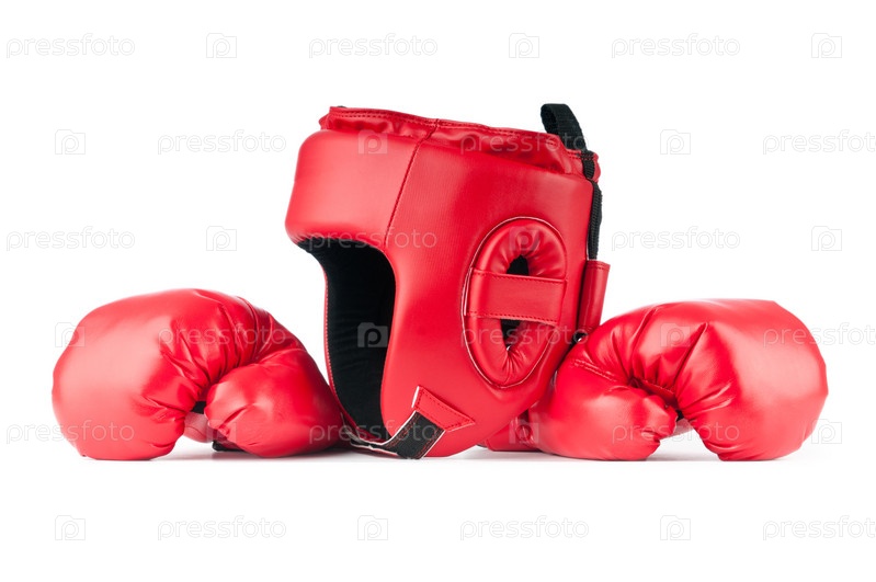 Красный боксерский шлем и пара перчаток на белом фоне
