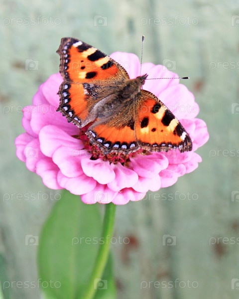 Красивая бабочка на розовом цветке цинии. Крупный план, серый фон