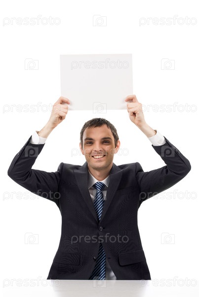 Изображение успешного мужчины, который поднимает пустую бумагу и смотрит в камеру с улыбкой