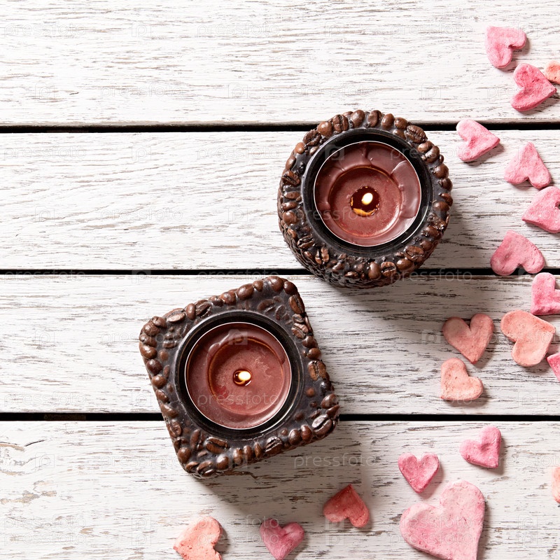 Две свечи на деревянный стол с кучей сердец