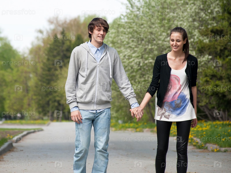 Молодая пара гуляет в парке, держась за руки