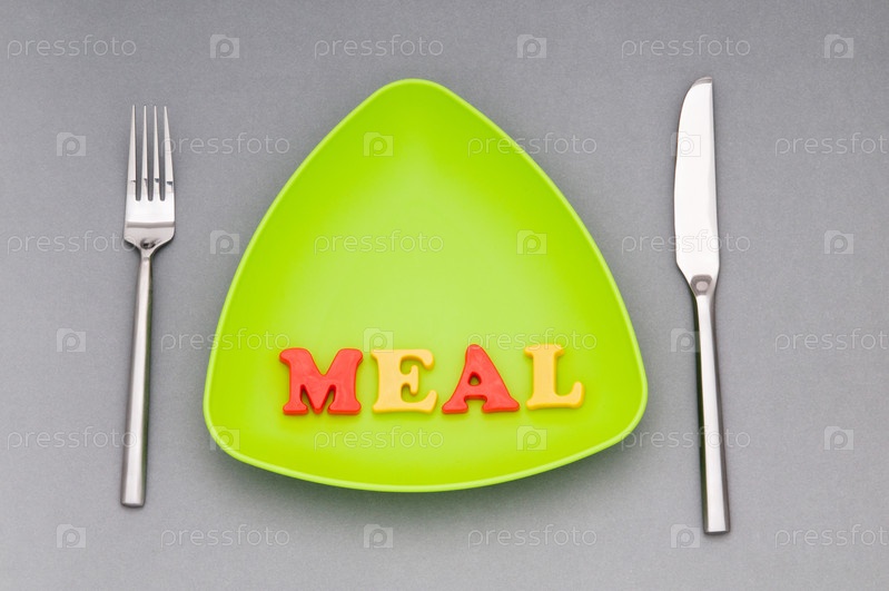 Тарелка со словом MEAL на сером фоне