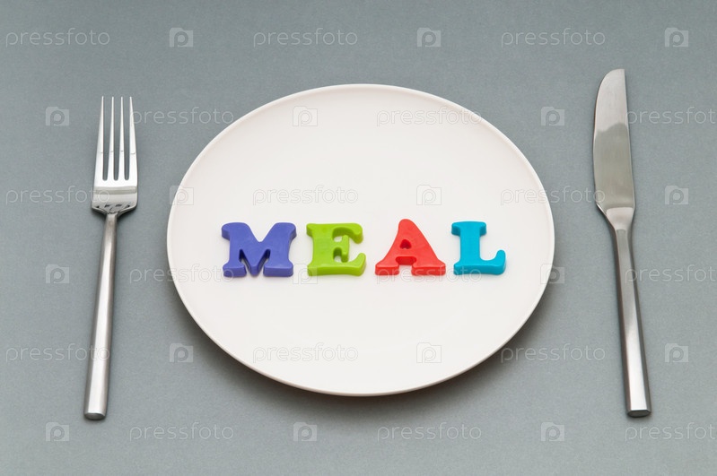 Тарелка со словом MEAL на сером фоне