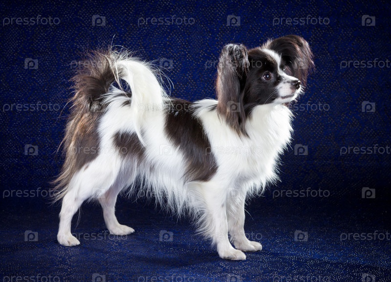 Собака породы папильон на темно-синем фоне. Студийная съемка