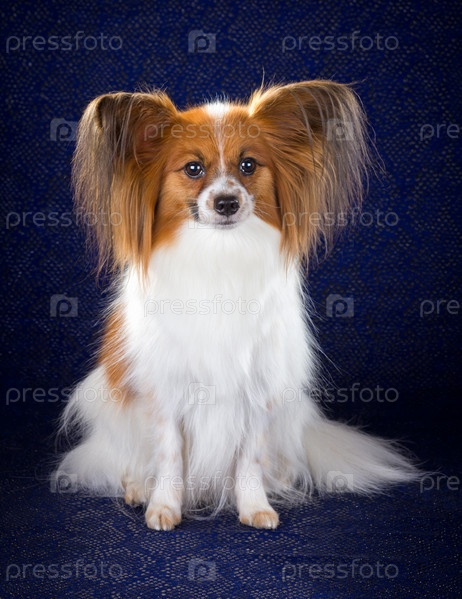 Собака породы папильон на темно-синем фоне. Студийная съемка