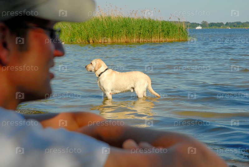 Человек с собакой, играя в воде