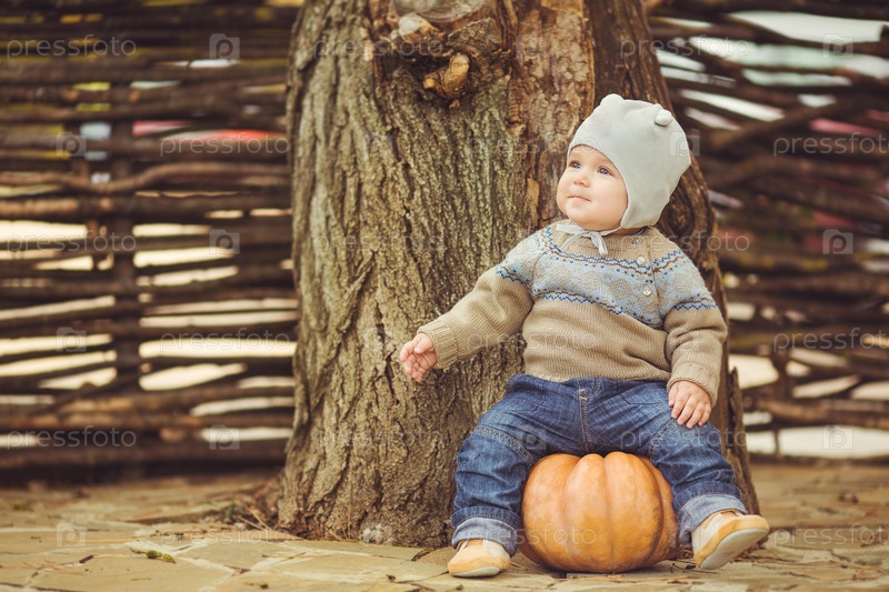 Ребенок сидит на тыкве
