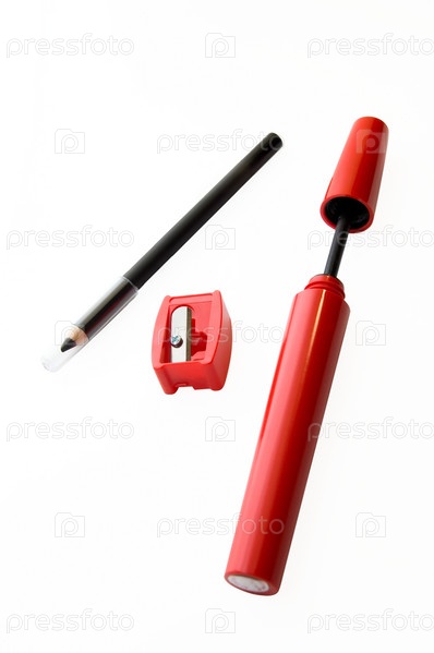 Тушь для ресниц, косметический карандаш и точилка на белом фоне
