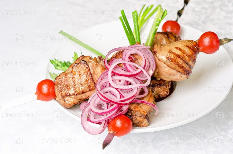 Шашлык с луком и помидорами на белой тарелке