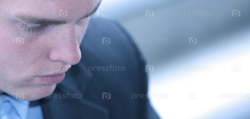 Молодой человек в голубом костюме, глядя вниз