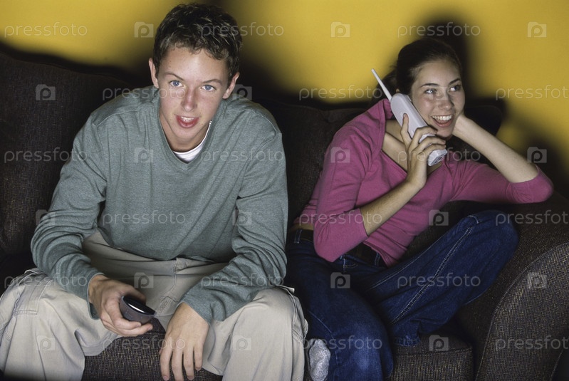 Мальчик и девочка-подросток, сидели на диване, смотреть телевизор