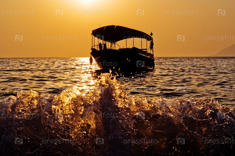 Силуэт морского судна на фоне красивого заката