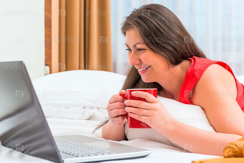 Улыбающаяся девушка внимательно смотрит на ноутбук и пить чай