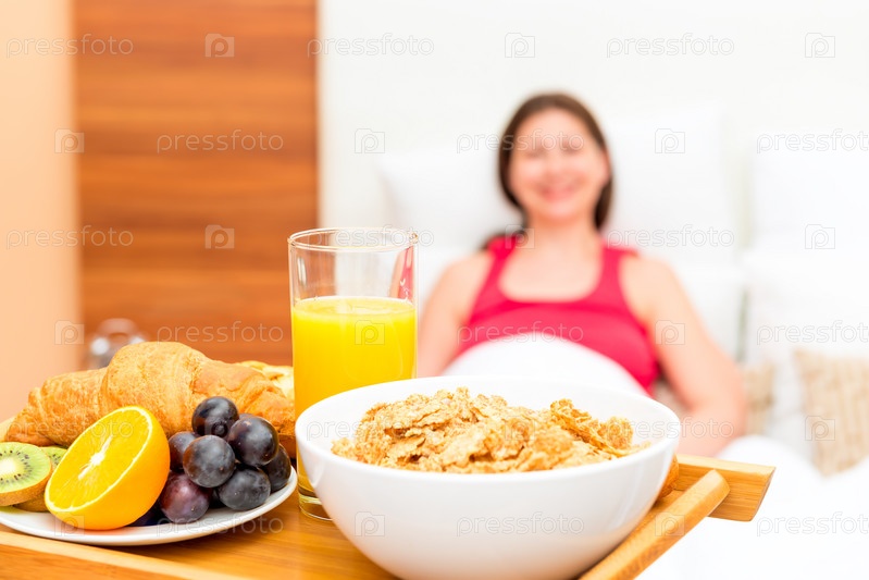 Макро завтрак на подносе и портрет девушки находится не в фокусе