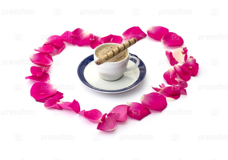 Лепестки роз, которые изложены и чашка кофе, тема любви