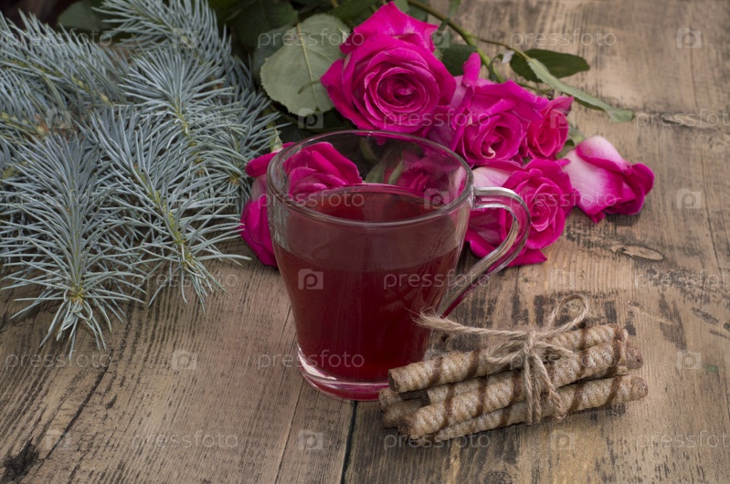 Розы, ель филиал и кружку сока в центре
