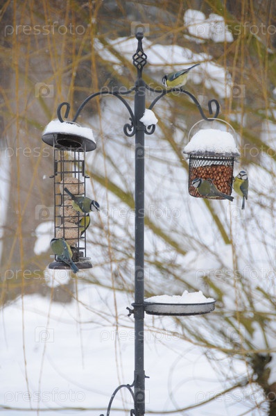 Птицы на фидер птицы в снегу