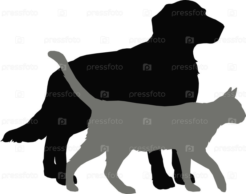 Векторные иллюстрации: силуэты черной собаки и серой кошки на белом фоне